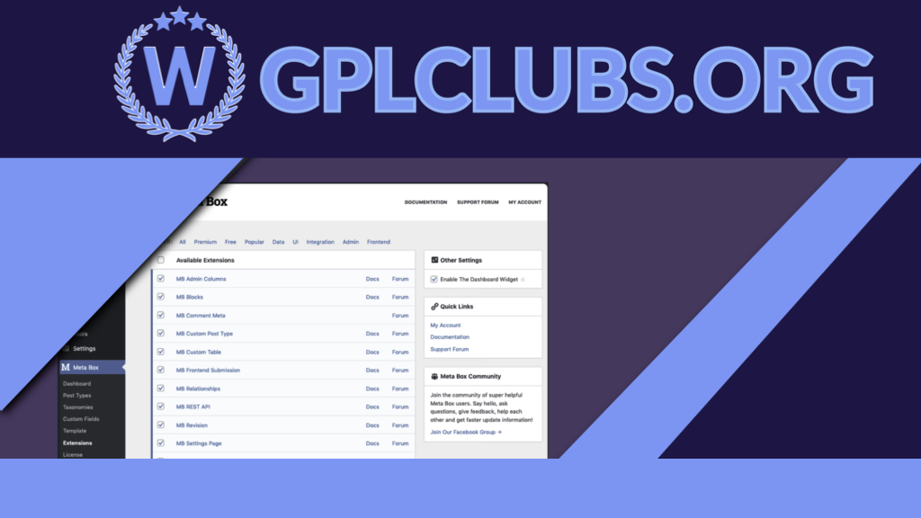 There is a unique plugin called Meta Box AIO that has all the extensions. To keep your plugin list simple and organized, you can install just one plugin and have everything.